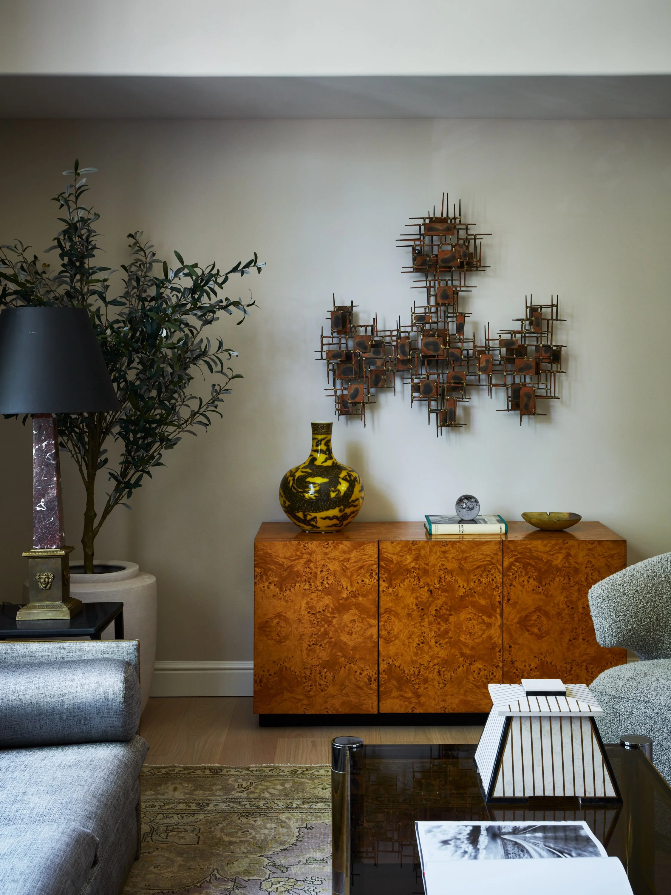 A bronze sculpture by Curtis Jere, sits on a black pedestal with a rotating and illuminating top, which anchors the room. A pair of antique rosso levanto marble column lamps are on either side of a vintage 3-seat Italian sofa with brass in-lay. Custom drapes help frame the spectacular view of the lower rose garden. The large 10 x 10-foot elliptical window was added during the construction and renovation of the existing house. Custom winged swivel chairs in a Pierre Frey boucle fabric adds warmth and contrast in relation to the polished nickel and brass smoked glass coffee table by Karl Springer along with the art deco lines of the Ron Seff side table.